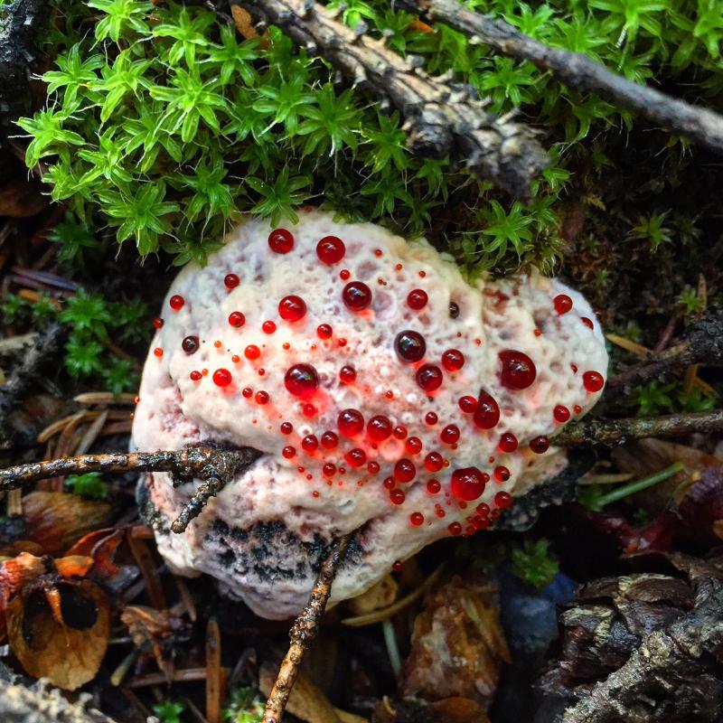 Hydnellum Peckii, sometimes called devil’s tooth mushroom, grows in North America, Europe, and was recently discovered in Iran and Korea. It’s one of the many species that grows in a beneficial relationship with coniferous trees, and another example of how many mushroom species are global residents, native to multiple continents. (Photo: Bob Berwyn)