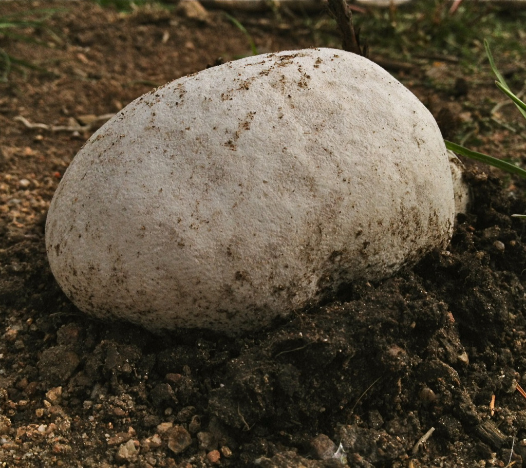 A giant Western puffball (Calvatia booniana) a little bigger than a softball grows in a mountain meadow near Frisco, Colorado. The fast-growing fungus can go from golfball to football size in just a few days. The pushed-up soil at the base of the mushroom attests to its life force. (Photo: Bob Berwyn)