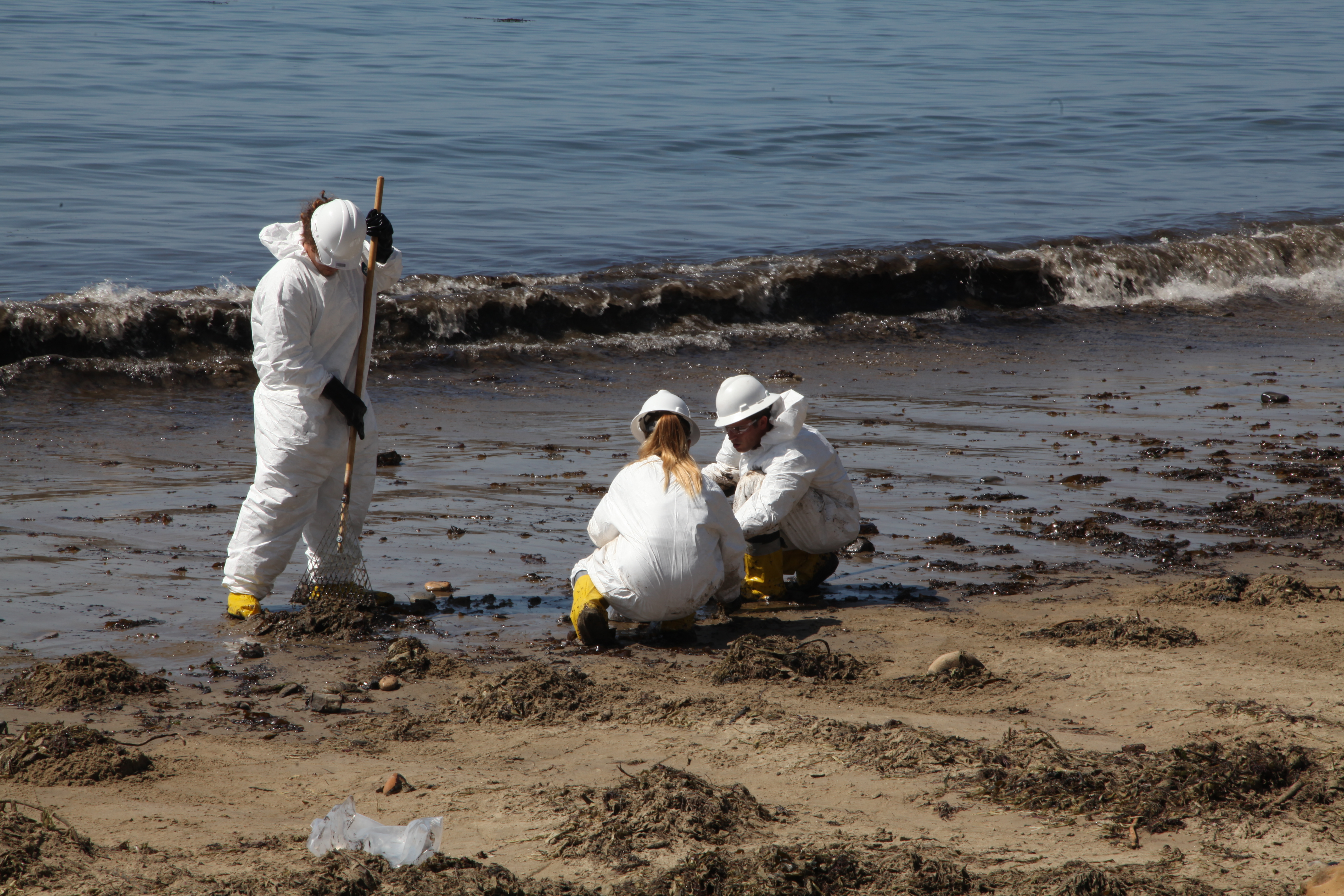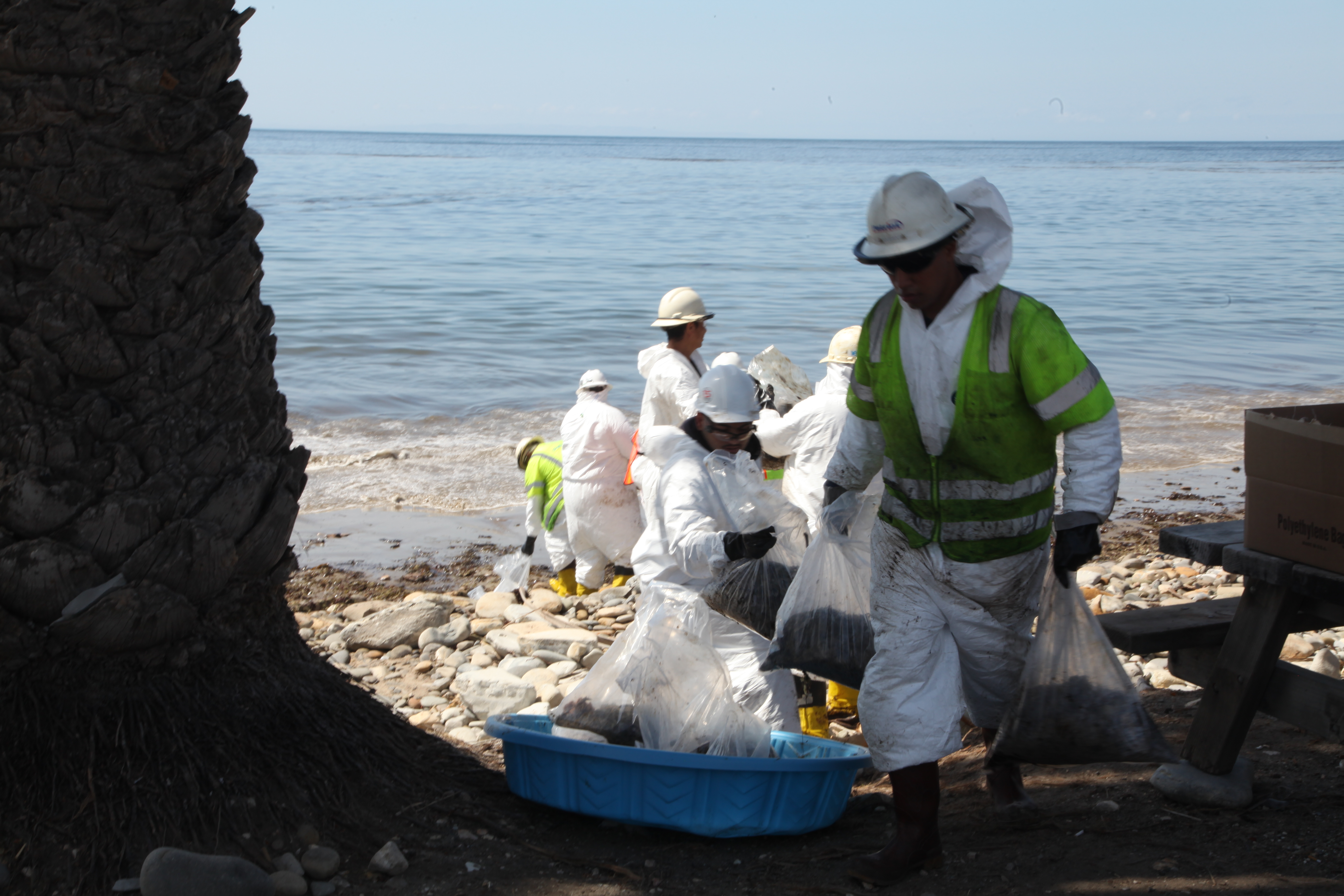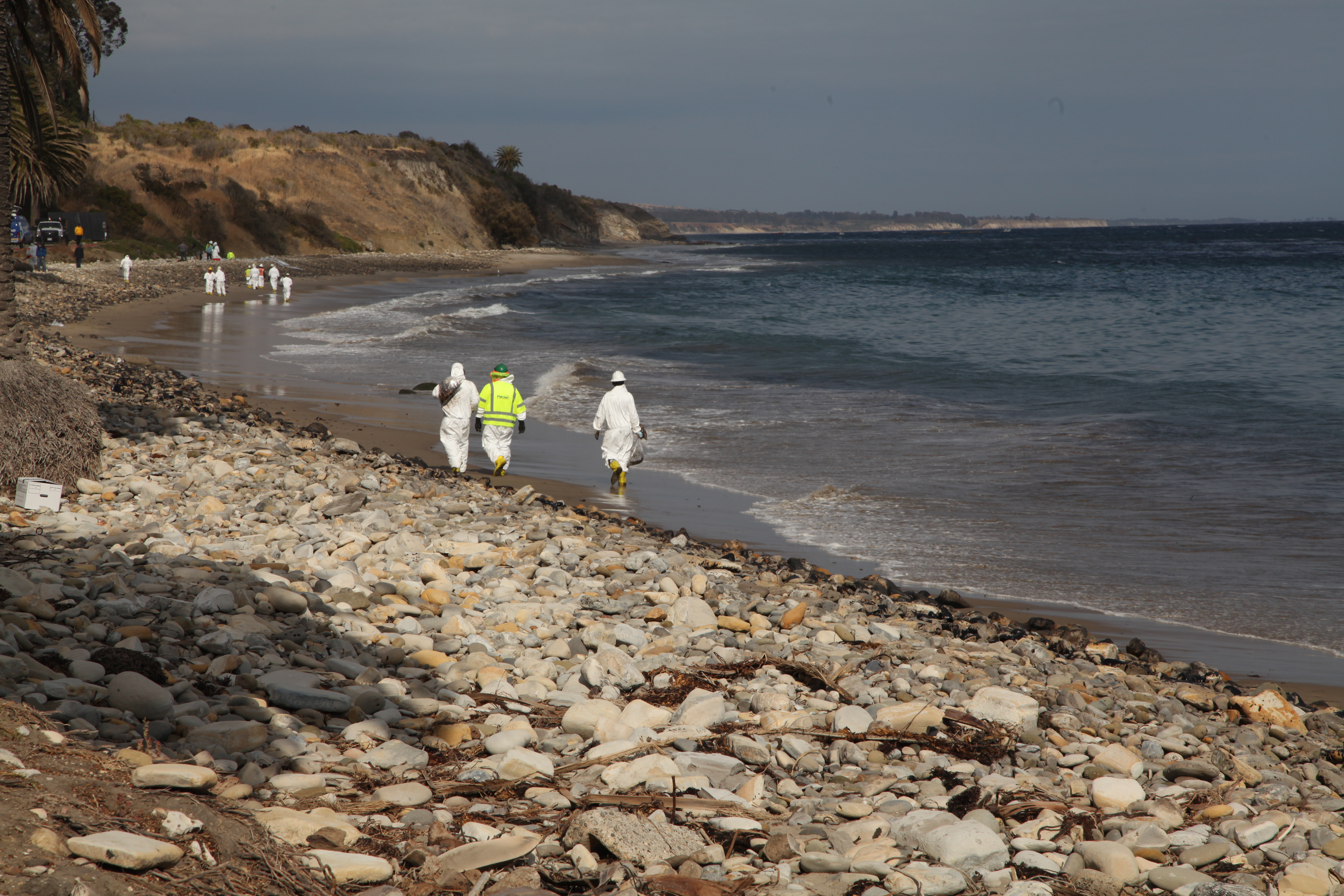 Oil spill clean-up crews walk the beach at Refugio State Park. Oil still coats the rocks at the high tide line. (Photo: Gail Osherenko)