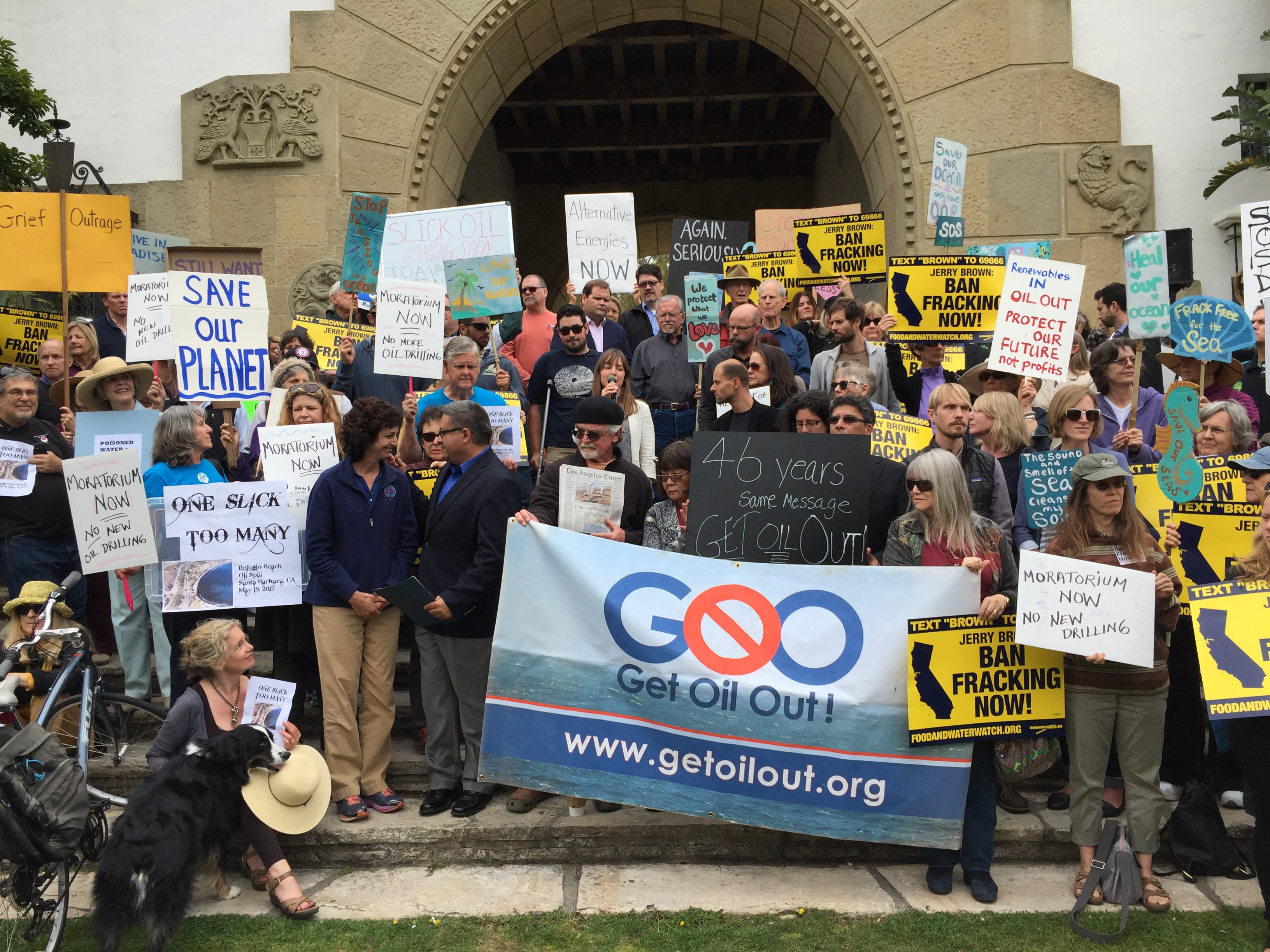 The organization Get Oil Out has been fighting to stop oil drilling since the 1969 Santa Barbara oil spill. On Thursday, members rallied on the steps of the Santa Barbara Courthouse. (Photo: Gail Osherenko)