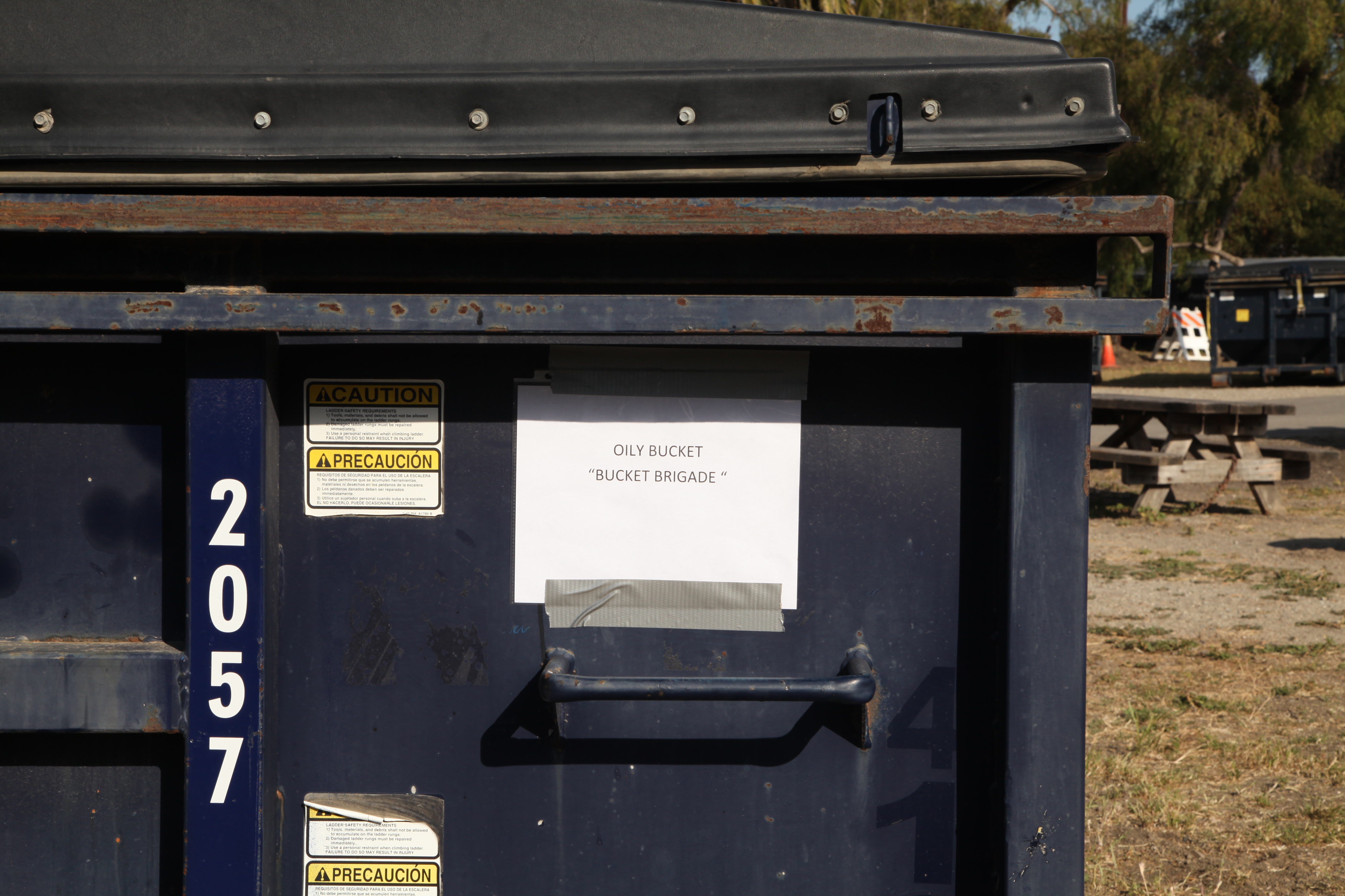 Huge trash bins in the parking lot at Refugio Beach State Park. Bins are labeled for “clean trash only,” “wildlife,” or “oily bucket (bucket brigade).” (Photo: Gail Osherenko)