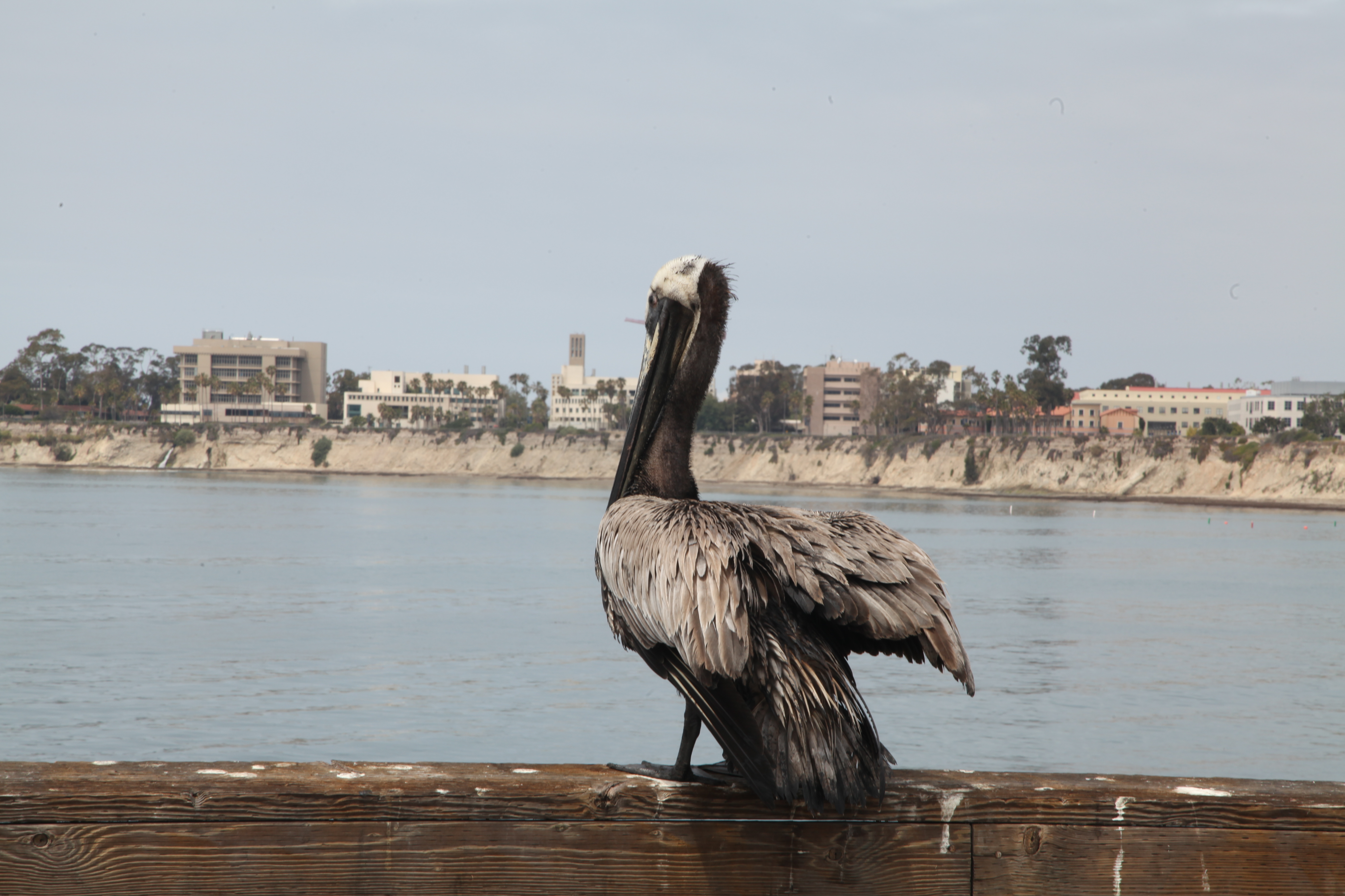 A pelican partially covered in oil, on Goleta Beach Pier. (Photo: Gail Osherenko)
